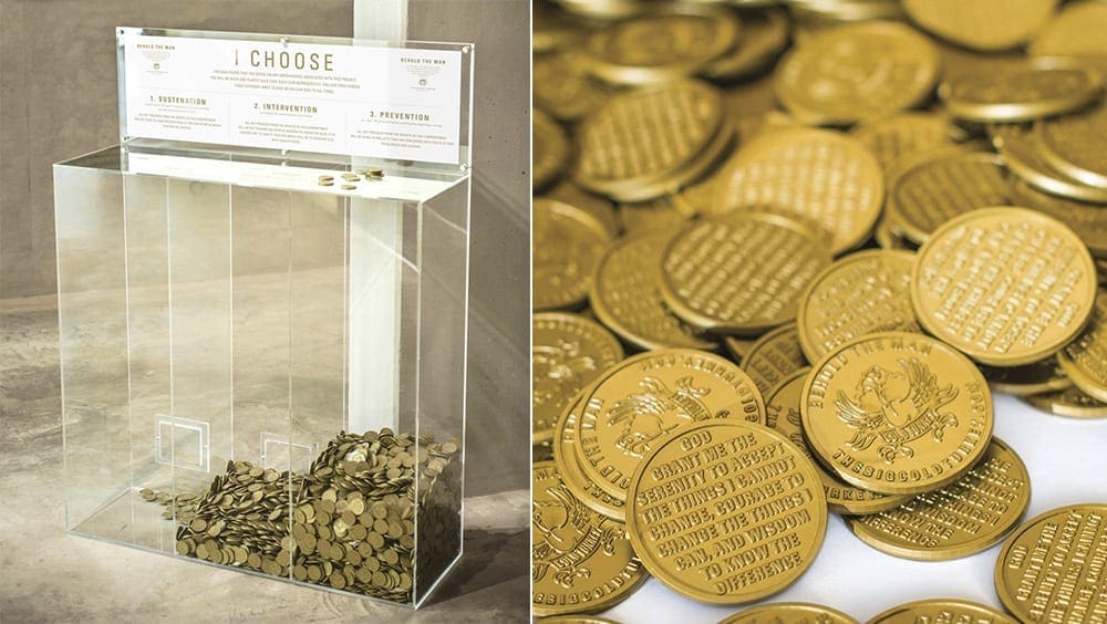 The Big Cold Turkey Foundation we set up in 2003 supports youth at risk or suffering from suffering addictions, or from the addictions of those close to them. As part of the aim to raise awareness around the effects of drug and alcohol abuse and other addictions, Marksteen embarked on a 3 year study working with Alan Dainton, a homeless beggar in Cheltenham battling addiction. The Big Cold Turkey worked with us to capture and visualise a two year collaborative study between ASHA’s partner, Marksteen Adamson. The beautifully produced book with a dust cover that opens up into a poster was launched at The Wilson Gallery. As part of the exhibition, visitors were invited to contemplate three huge portraits of Alan, displayed in a triptych, each representing a different state of mind. With a supporting video and book documenting Alan’s journey, visitors had the opportunity to help Alan and those in similar situations by purchasing collateral and donating plastic gold coins in one of three ways – sustentation, intervention and prevention.